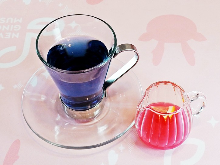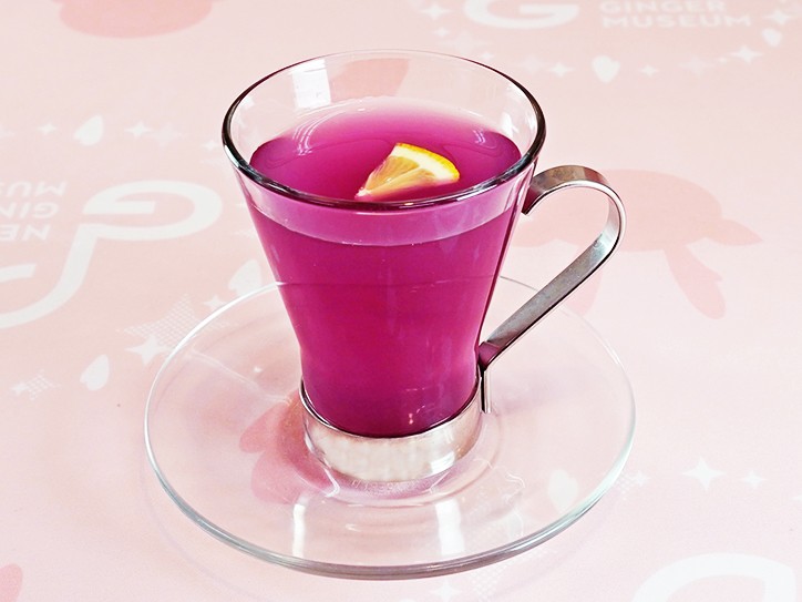 鮮やかな青色が特徴のバタフライピーティーをピンクジンジャーシロップでピンクにチェンジ!見た目も楽しめるホットドリンクです。