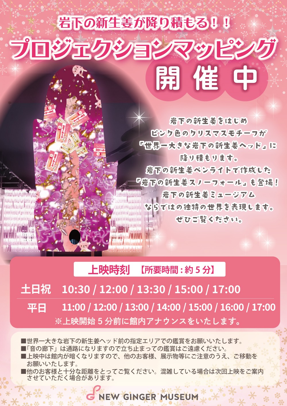 人気のフォトスポット「世界一大きな岩下の新生姜ヘッド」に、岩下の新生姜をはじめ、ピンク色のクリスマスモチーフが降り積もるプロジェクションマッピングを、イベント期間中毎日開催(休館日除く)。