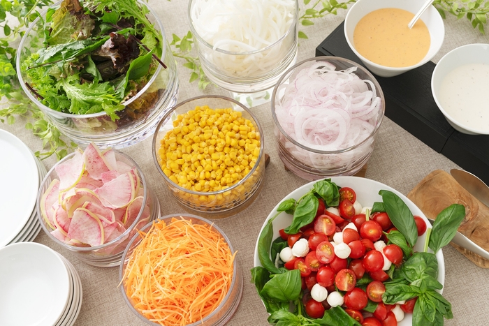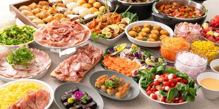 こだわりの朝食は、「国産豚のローストポーク トンナートソース」、「ガーリックシュリンプ」、「トマトとバジルのアランチーニ ミートソース」などの温製料理、「藁焼きカツオのタタキサラダ」、「ミニトマトとチェリーモッツァレラ ジェノヴァ風」、「イカと国産十穀米のパスタサラダ」などの冷製料理に加え、「ハモンセラーノ」、「ミラノサラミ」、「フォカッチャ」など、イタリアンレストランならではの料理を取り揃えました。また、発酵食を取り入れた「塩麹バジルのポテトサラダ」、大豆ミートを使用した「プラントベースチキンと緑黄色野菜」、ビタミン補給におすすめの「サプリメントアップル」など、こだわりのメニューやドリンクもご用意いたします。