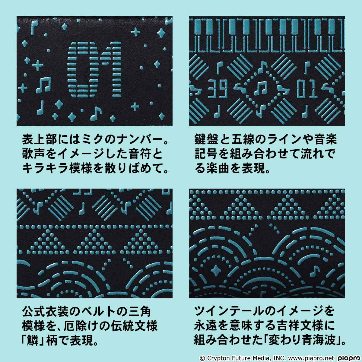 伝統的な文様に、ミクのモチーフを組み合わせた繊細で美しいデザイン。ミクのツインテールのイメージと永遠を意味する吉祥文様を組み合わせた「変わり青海波」に、ミクへの変わらない想いを込めて。
