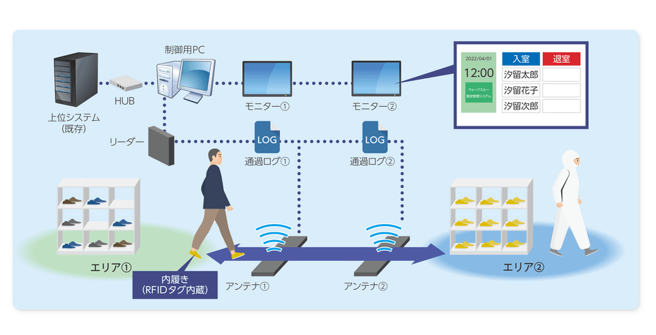 デジタルハイブリッドのトッパン・フォームズ株式会社(以下トッパンフォームズ)は株式会社ブルボン(以下ブルボン)様と、ブルボン様の製造工場向けに「ウォークスルー型勤怠把握システム」を共同開発しました。これまでに6工場を対象とする導入の第1フェーズが終了、4月より安定稼働に入ったことをお知らせします。本システムは、ブルボン様が内履きにRFID タグを組み込む方式を考案し、トッパンフォームズとマット型アンテナの上を通過するだけで勤怠情報が得られる仕組みを構築しました。専用マットを通過することによりID情報を読み取り、名前をモニターに表示することで勤務者は打刻を確認します(図参照)。