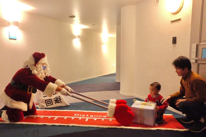 イベント期間中、サンタクロースが客室にプレゼントを届けるサービス「デリバリーサンタ」を実施します。今年はコロナ対策を徹底したサンタクロースが登場。サンタクロースと子どもが立つ位置を示した「ディスタンスカーペット」を使って2メートルの距離を保ち、密接を回避します。プレゼントは大きなサンタの手をイメージした「ディスタンスハンド」で渡します。さらに、飛沫感染対策として、サンタクロースは花火柄のマスクを着用します。