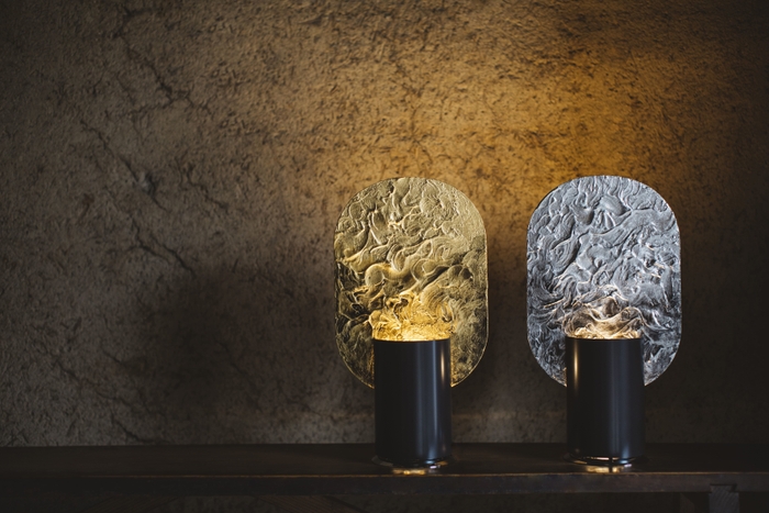 シェードは裕人 礫翔氏が一つひとつ手作業で仕上げています。同じ模様は二つとありません。24金(金99.9%)の金箔またはプラチナ箔を貼っており、表面は月面のような凹凸を、裏面には流線型の模様を描いています。土台は遠藤 道明氏がシェードに合うよう一からデザインを起こし、心が和んで落ち着く光に仕上がっています。