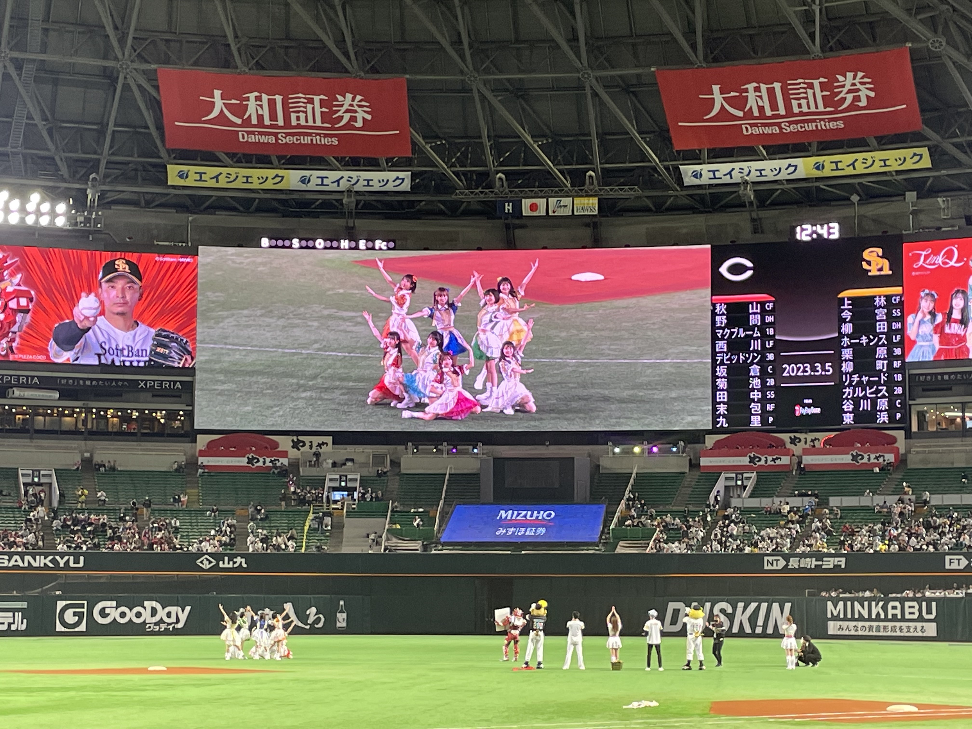 オープン戦開始前のセレモニーでLinQは球場のグランド内で新曲「FANTASTIC WORLD」のパフォーマンスを初披露し集まったホークスファンへ笑顔でエールを送った。