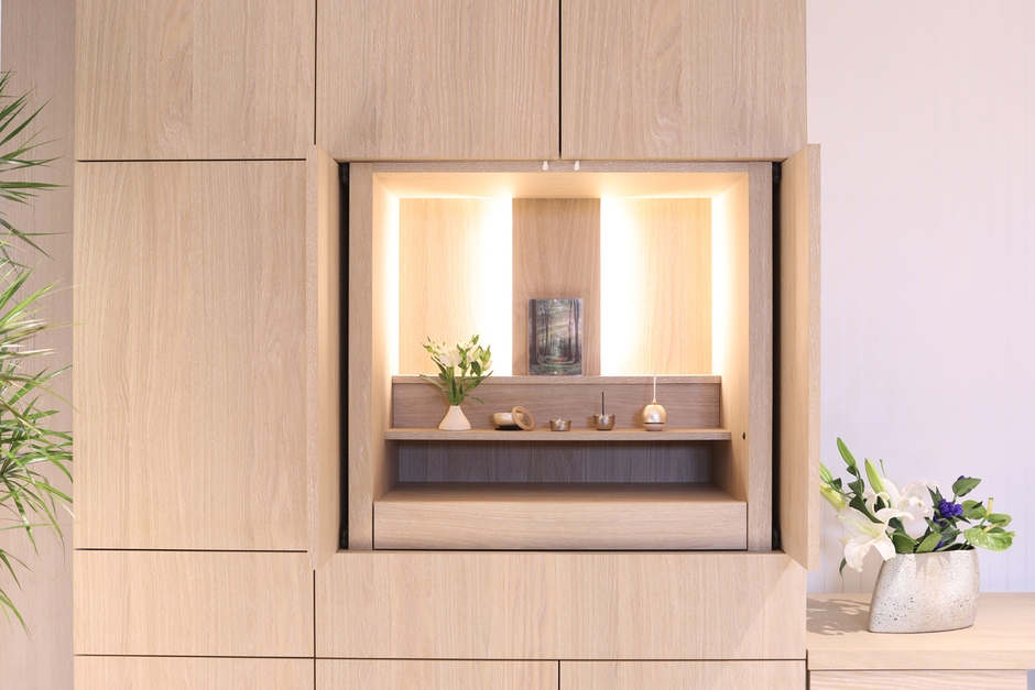 日常生活で使う収納の一角が、“祈りの場”となることで「室内空間を確保しつつ、身近に祈りを捧げる空間をつくる」という2つのテーマを同時に解決いたします。