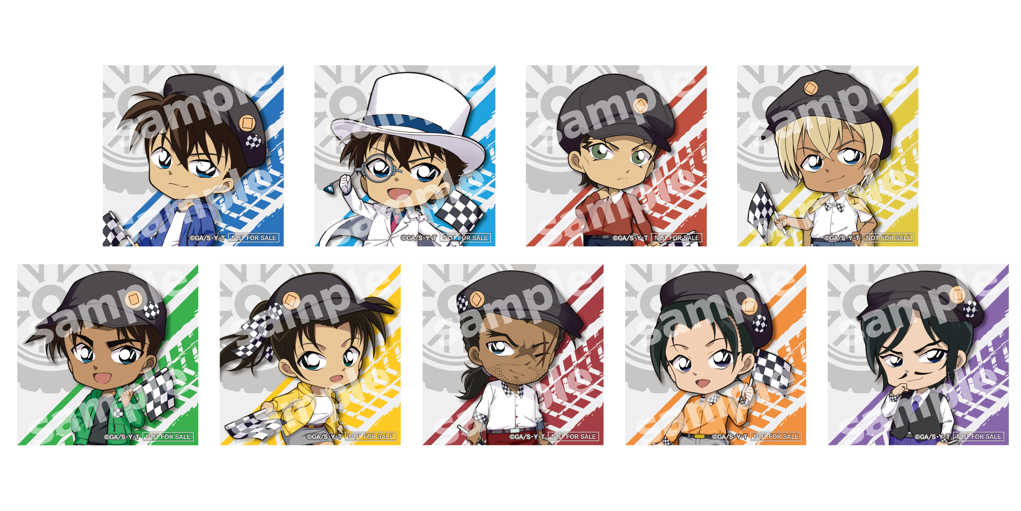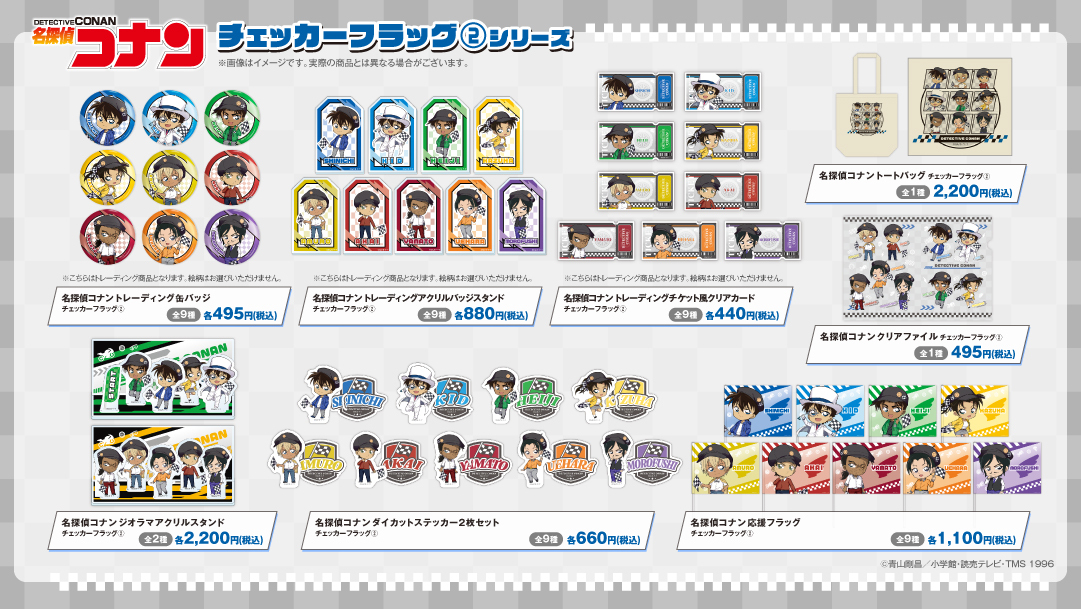 第1弾の4月10日(金)発売「チェッカーフラッグ(1)」では、江戸川コナン、毛利蘭、灰原哀、萩原千速、横溝重悟、世良真純、萩原研二、松田陣平の全8キャラクターがラインナップ。続く第2弾、5月1日(金)発売「チェッカーフラッグ(2)」では、工藤新一、怪盗キッド、服部平次、遠山和葉、安室透、赤井秀一、大和敢助、上原由衣、諸伏高明の全9キャラクターが新たに加わり、例年よりボリュームアップした商品ラインナップで皆様をお出迎えいたします!