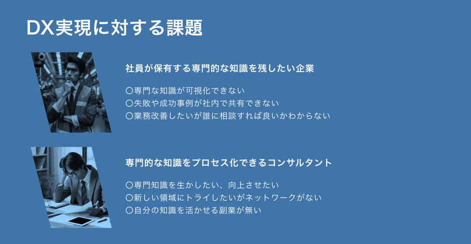 CSPPは、「社員が保有する専門的な知識を残したい企業」と、「専門的な知識をプロセス化できるコンサルタント」とを効率的にマッチングします。これにより、企業内の知識が体系化され、だれでもアクセス可能な形で保存されます。