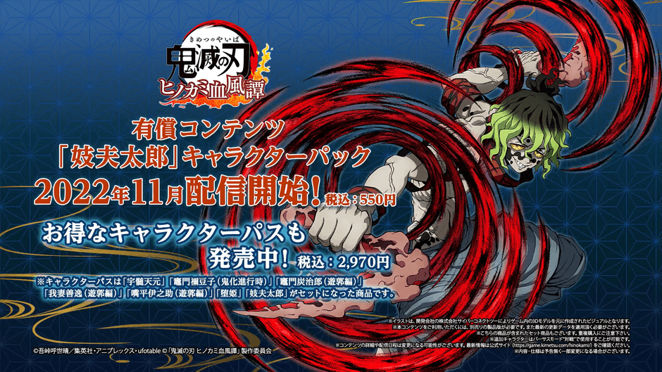 株式会社アニプレックス(本社:東京都千代田区 代表取締役 岩上敦宏 以下アニプレックス)は、家庭用ゲームソフト『鬼滅の刃 ヒノカミ血風譚』(PlayStation🄬5 / PlayStation🄬4 / Xbox Series X|S / Xbox One / Steam🄬 / Nintendo Switch™)におきまして、有償コンテンツ「妓夫太郎」キャラクターパックを本日配信したことをお知らせいたします。
