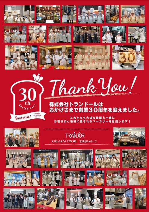 JR九州グループのベーカリーチェーン、株式会社トランドール(本社:福岡市東区、代表取締役社長:有隅基樹)は、2022年4月1日に創業30周年を迎えます。日頃からご愛顧いただいているお客さまに心からの感謝を込めて、全27店舗にて創業祭を開催いたします。これからも大切な仲間と一緒に、お客さまと地域に愛されるベーカリーを目指して参ります。