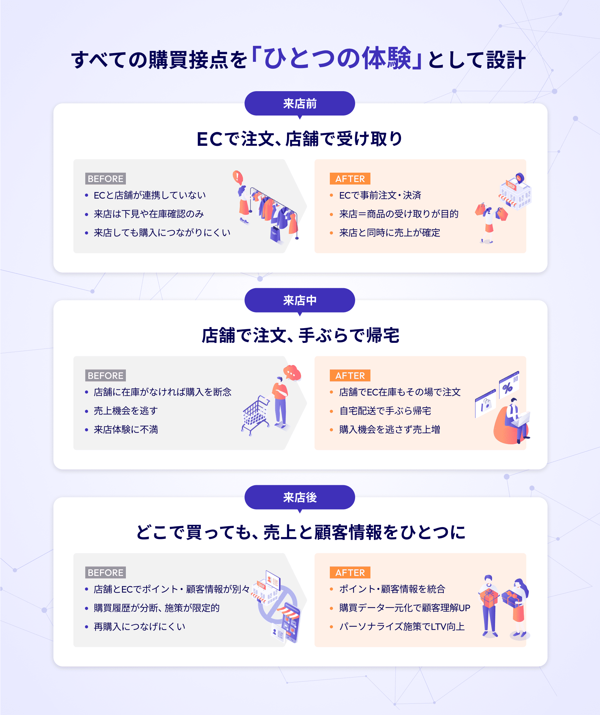 本パッケージにより、ECと店舗それぞれに分断されていた在庫、注文、ポイント、顧客データを横断的に統合し、来店前・来店中・来店後のすべての購買接点をひとつの体験として設計することが可能になります。