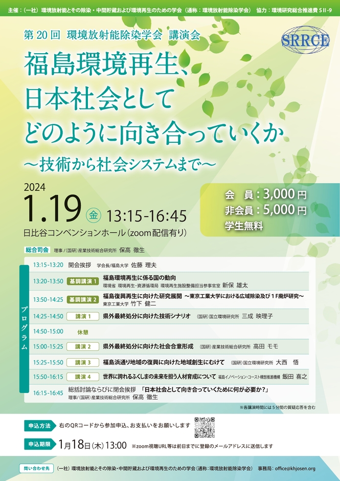 第20回環境放射能除染学会 講演会 「福島環境再生、日本社会としてどのように向き合っていくか ~技術から社会システムまで~」 2024年1月19日(金)日比谷コンベンションホール (Zoom配信あり)