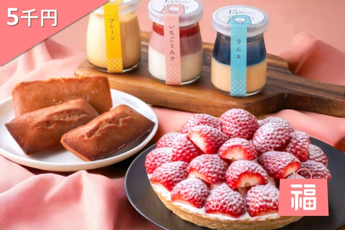 ■内容量:❶いちごの里タルト 1個(直径15㎝)❷15時のプリン プレーン 1本 ❸15時のプリン ラムネ 1本 ❹15時のプリン いちごミルク 1本 ❺たっぷり苺のフィナンシェ 3個