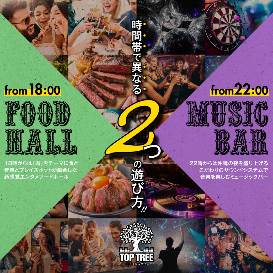 TOP TREEは、様々なエンタメコンテンツ満載の屋内エリア「TOP FLOOR」と、ガジュマルの木がそびえ立つ開放的なルーフトップエリア「TREE FLOOR」で構成されており、広々とした店内には、「肉」をテーマに、沖縄はもちろん日本各地から人気店7店舗が集まり、バラエティ豊かなお食事をご提供いたします。
