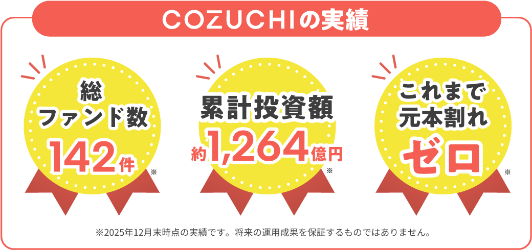 COZUCHIはサービス開始以降、総ファンド数142件/累計投資額約1,264億円の実績があり、今まで培ってきたノウハウや物件選定の目利き力に定評があります。