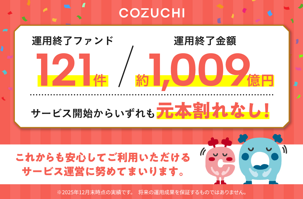ファンド121件/約1,009億円を元本毀損なく運用終了! 不動産投資クラウドファンディングサービス「COZUCHI」