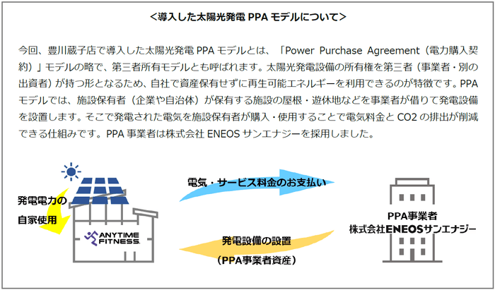 24時間年中無休フィットネスジム「ANYTIME FITNESS(エニタイムフィットネス)」の国内マスターフランチャイジーとして全国で直営店舗の運営及びフランチャイズ展開を行う株式会社Fast Fitness Japan(本社:東京都新宿区 代表取締役社長:山部清明)は、グリーン電力利用の推進に向けた試験的な取り組みとして、直営店である豊川蔵子店(愛知県豊川市)に太陽光パネルを設置し、店舗でのグリーン電力の利用を開始いたしました。
