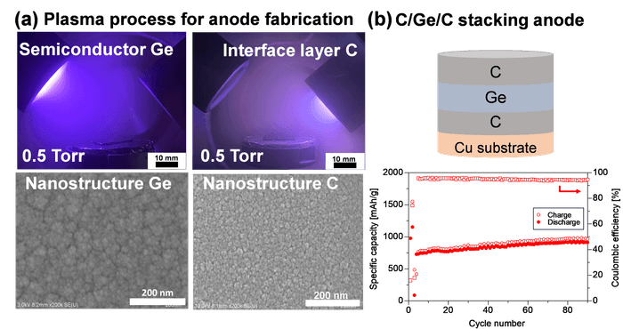 図(a):独自の高圧プラズマスパッタリングでナノ多孔質のゲルマニウム (Ge)/カーボン (C) 積層負極を作製。
