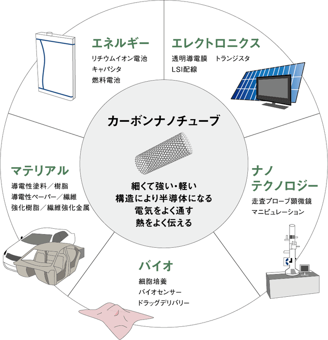 構造によって多彩な性質となるカーボンナノチューブは、さまざまな産業界で応用が期待されています。