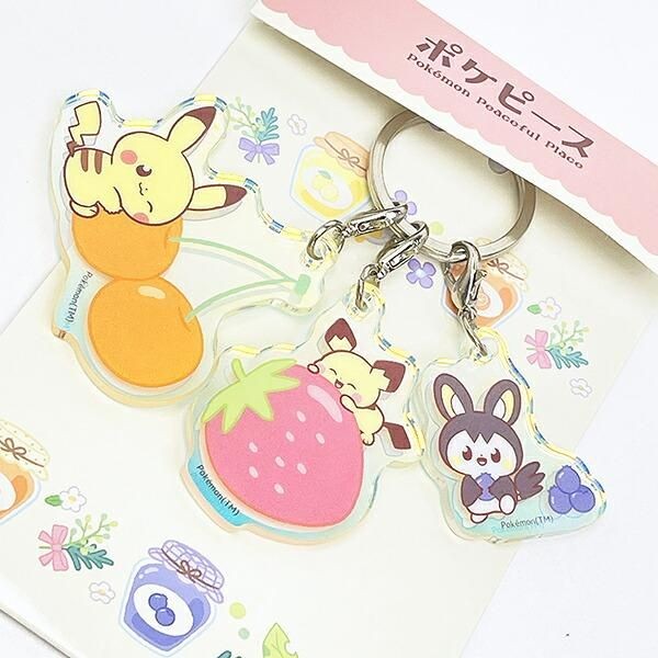 いちごに乗ったピチューがかわいい。3つ連なっているので、特別感を感じられますね。このキーホルダーをひとつ付けるだけで、鞄やポーチが華やかに可愛く彩られそうです!