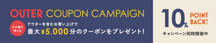 期間中にアウターを含む商品のお買い上げ合計金額に応じて、その場で使える最大5,000円分のクーポンをプレゼントいたします。