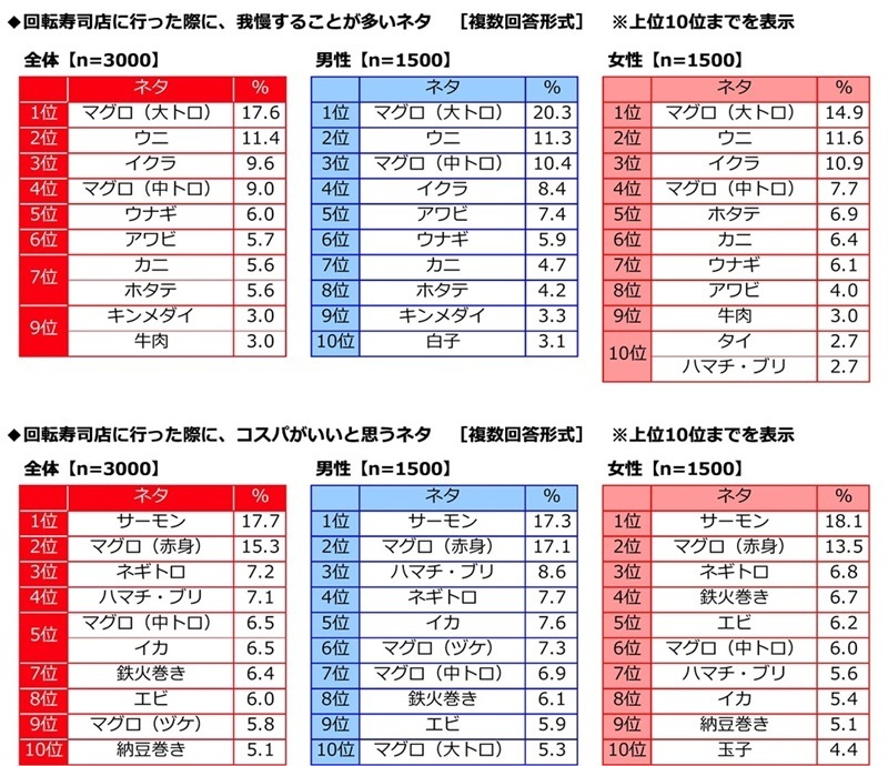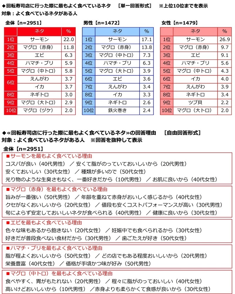 男女別にみると、男性では1位「マグロ(赤身)」(15.4%)、2位「サーモン」(14.7%)、3位「マグロ(中トロ)」(8.0%)、女性では1位「サーモン」(24.2%)、2位「マグロ(赤身)」(11.2%)、3位「エビ」(7.1%)となりました。
