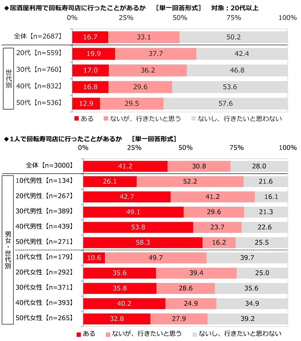 全回答者(3,000名)に、1人で回転寿司店に行ったことがあるか聞いたところ、「ある」は41.2%、「ないが、行きたいと思う」は30.8%となりました。