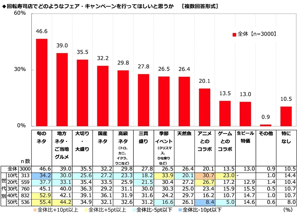 全回答者(3,000名)に、回転寿司店でどのようなフェア・キャンペーンを行ってほしいと思うか聞いたところ、1位「旬のネタ」(46.6%)となりました。手軽に旬のネタを食べたいという人が多いようです。次いで高くなったのは、「地方ネタ・ご当地グルメ」(39.0%)、「大切り・大盛り」(35.5%)、「国産ネタ」(32.2%)、「高級ネタ(トロ、カニ、イクラ、ウニなど)」(29.8%)でした。