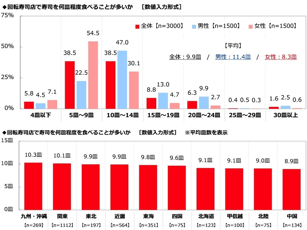 エリア別にみると、食べる皿数が最も多かったのは九州・沖縄(10.3皿)、次いで関東(10.1皿)、東北と近畿(いずれも9.9皿)が続きました。