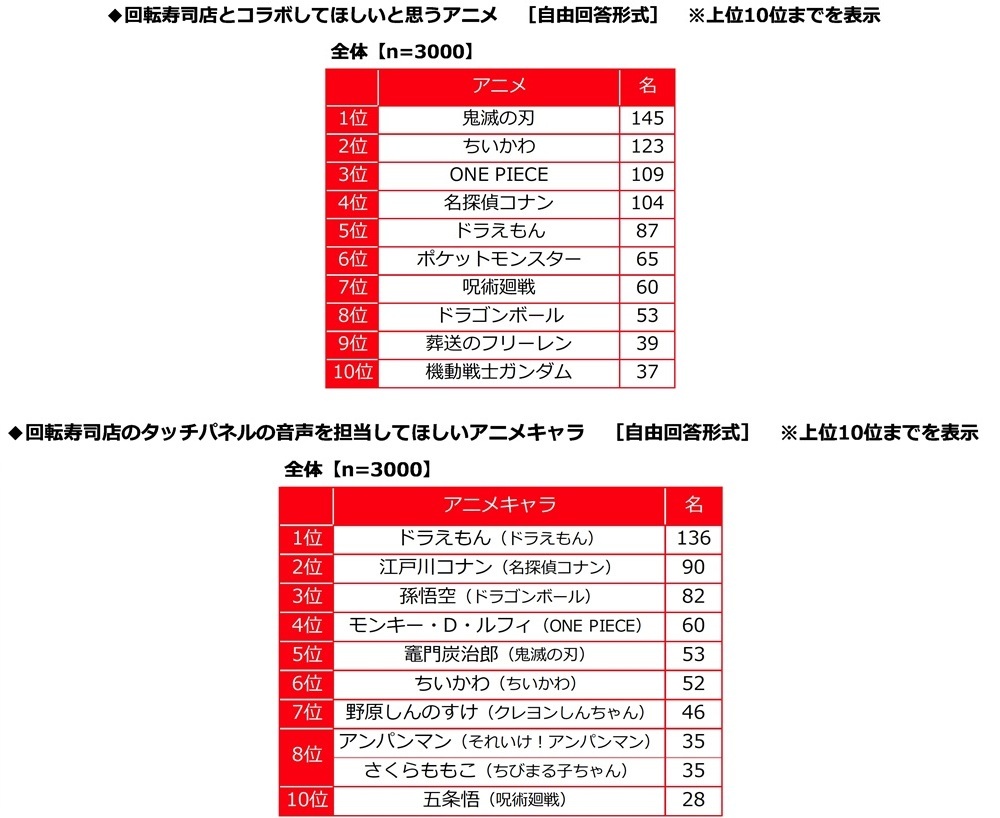 また、回転寿司店のタッチパネルの音声を担当してほしいアニメキャラを聞いたところ、1位「ドラえもん-ドラえもん-」(136名)、2位「江戸川コナン-名探偵コナン-」(90名)、3位「孫悟空-ドラゴンボール-」(82名)、4位「モンキー・D・ルフィ-ONE PIECE-」(60名)、5位「竈門炭治郎-鬼滅の刃-」(53名)となりました。