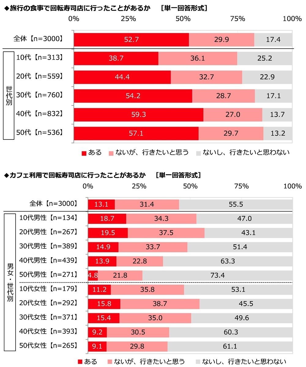 全回答者(3,000名)に、旅行の食事で回転寿司店に行ったことがあるか聞いたところ、「ある」は52.7%となりました。また、「ないが、行きたいと思う」は29.9%となりました。