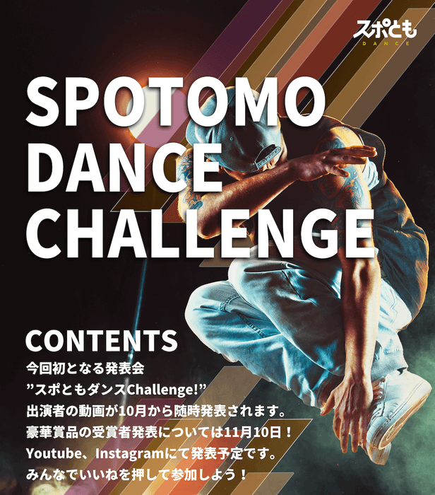 ダンスに特化したオンラインレッスンアプリ『スポともダンス』を提供する株式会社だんきち(本社:大阪府摂津市、代表取締役社長:与島 大樹)は、Instagramへの投稿型オンライン発表会『スポともダンス Challenge!』を開催し、発表会の総まとめ及び受賞者の発表を11月10日に『スポともダンス』公式YouTubeで行います。
