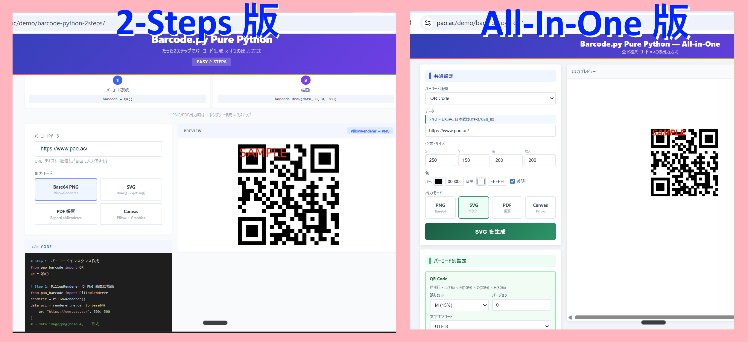 なお、全製品のデモサイトには「2ステップ版」と「All-in-One版」の2種類が用意されている。たった2ステップのコードでバーコードが生成される体験から入門し、全バーコード種類・全機能を試せるAll-in-Oneで全貌を把握する。この2段構えが、すべての製品に共通している。