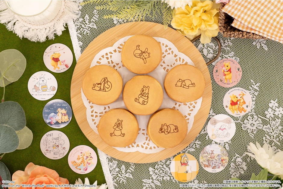 昨年大好評を頂いた「くまのプーさん」のまんまる焼きがリニューアルして再登場します。カスタード味のクリームが入ったまんまるもちもち生地の今川焼きです。表面には、オリジナルデザイン焼き印が押されています。昨年販売した3種の焼き印に、新規デザイン3種を加えた全6種のさまざまな愛らしいポーズのくまのプーさんを楽しめます。また、くまのプーさんのゆったりとした世界観を反映した、可愛く、おしゃれなテイストのシールもランダムで1枚付属。リニューアルされたデザイン全10種の中から1種が付属します。
