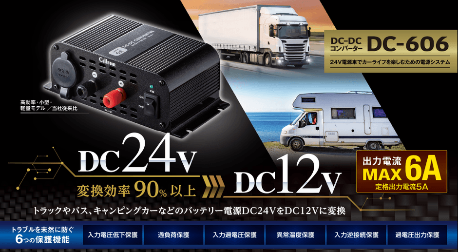 トラックやバス、キャンピングカーなどの バッテリー電源DC24VをDC12Vに変換。 DC-DCコンバーター「DC-606」を セルスター工業より6月発売。