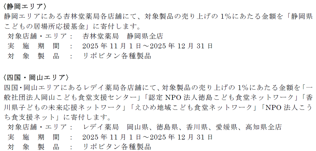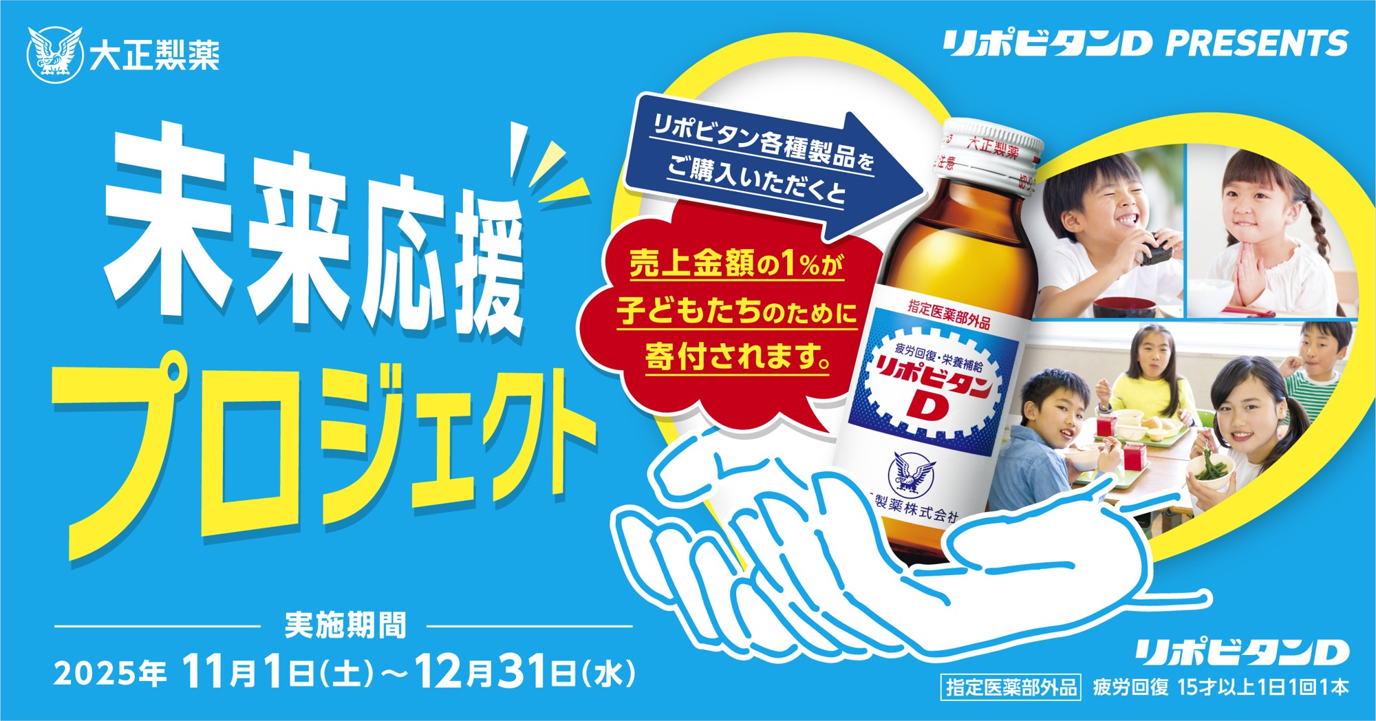 大正製薬株式会社[本社:東京都豊島区 社長:上原 茂](以下、当社)は、株式会社ツルハホールディングスご協力の下、北海道・東北・中国・静岡・四国エリアの同社・ツルハドラッグ、ウォンツ、ドラッグストアウェルネス、杏林堂薬局、レデイ薬局各店舗における、リポビタン各種製品の売り上げの一部を寄付する「子どもたちのみらいのために 未来応援プロジェクト2025」を11月1日(土)より実施いたします。