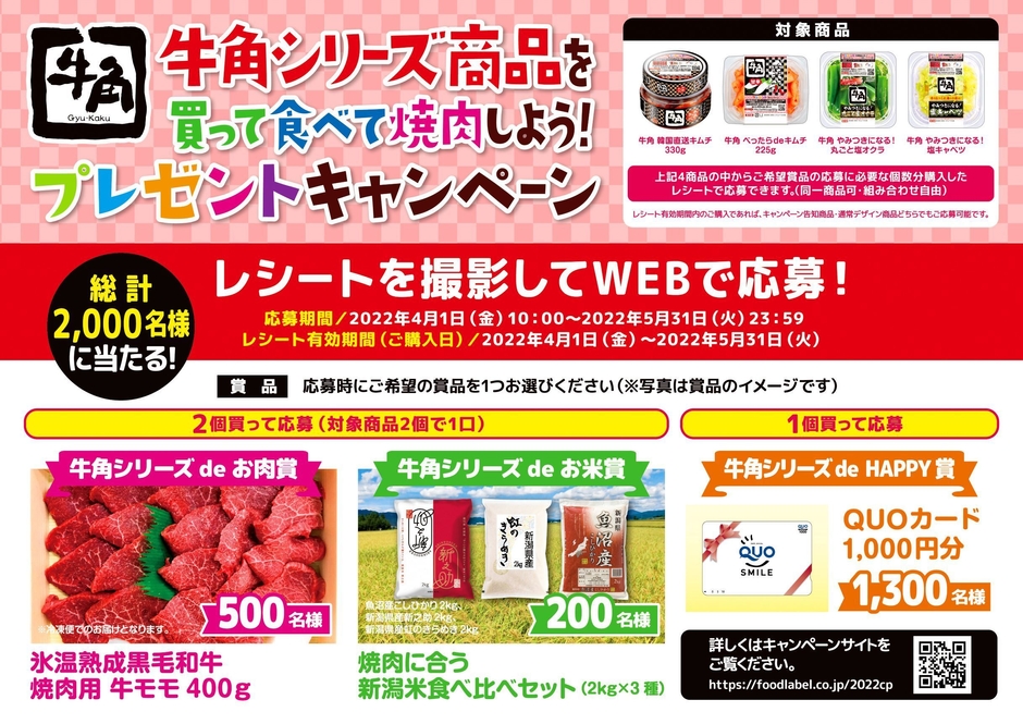 お肉賞では氷温熟成でお肉の旨味成分が増加した「氷温熟成黒毛和牛焼肉用牛モモ400g」を500名様に、お米賞では五つ星お米マイスターが厳選した「焼肉に合う新潟米食べ比べセット(2kg×3種)」を200名様に、HAPPY賞ではQUOカードを1,300名様にプレゼントいたします。総計2,000名様に当たるプレゼントキャンペーンです。