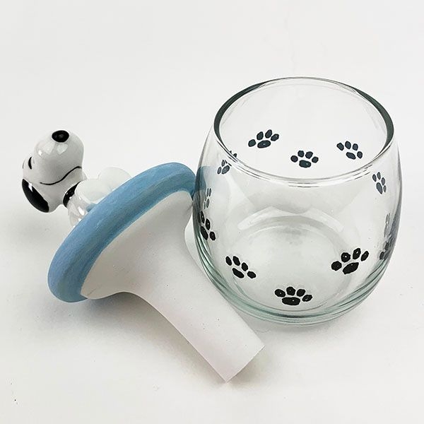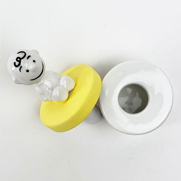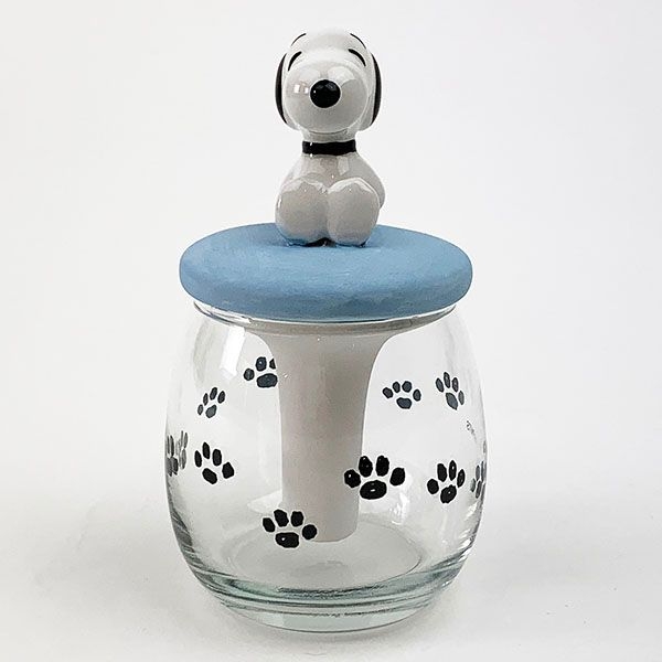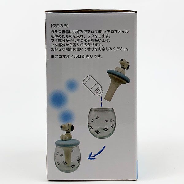 スヌーピーのアロマディフューザーです。ポットの部分はガラス製、フタとフィギュアは陶器でできています。ポットにお好きなアロマを適量いれていただくと陶器のフタから揮発し、香りが広がります。