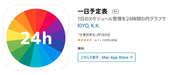 1日の予定表を24時間の円グラフで表示し、さらに合計時間の自動計算・グラフでの推移表示・日記の登録や目標の設定などが行える多機能な無料アプリです。