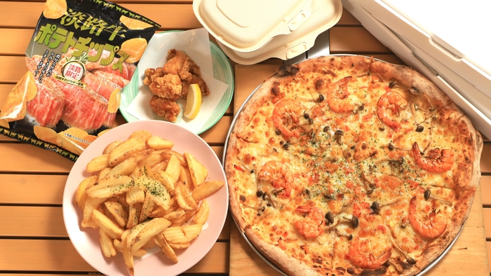 お好きなピザ、フライドポテト、鶏のから揚げ、淡路島ポテトチップス ※各1つ