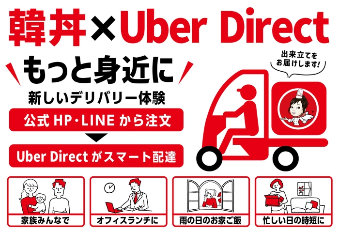 今回の導入により、お客様は韓丼の公式HPやテイクアウト&デリバリーページ、LINE から直接ご注文いただけるようになり、Uber 配達パートナーによるスマートなお届けが可能となります。