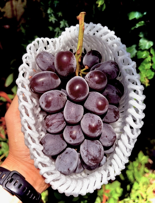 『マスカットノワール』は黒い果皮ではありながらも、爽やかな甘さとマスカットの華やかな香りが美味しい希少なブドウです。ジーコとシャインマスカットを交配して作られた希少品種です。味の分類としてはシャインマスカットに似ているが、紫ぶどうらしくコクが感じられる逸品です。
