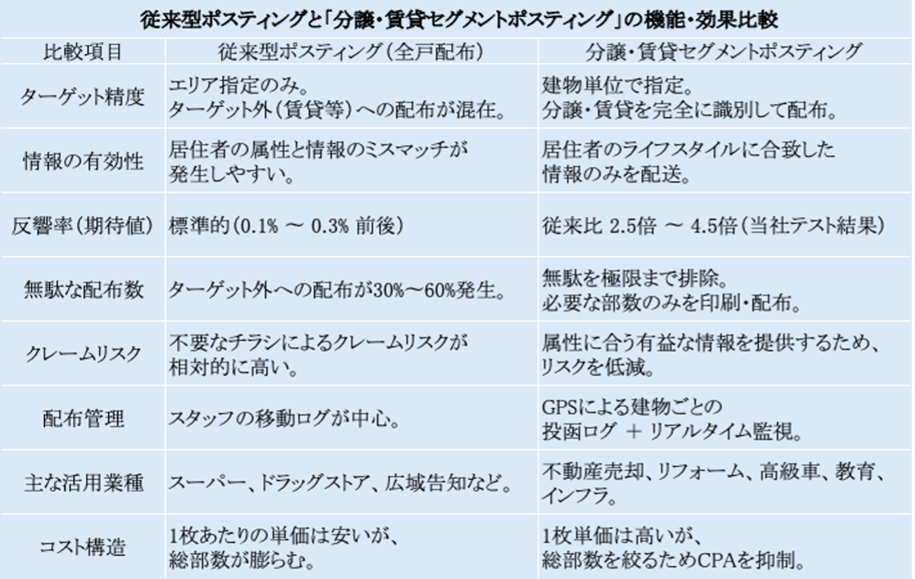 株式会社ポスティング・サービス(本社/愛知県名古屋市)は、日本全国の建物情報を網羅した独自の「建物属性データベース」を基盤に、分譲住宅と賃貸住宅を1棟単位で完全に識別して配布を行う、不動産・インフラ・自治体特化型の新サービス「分譲住宅・賃貸住宅セグメントポスティング」開始致しました。