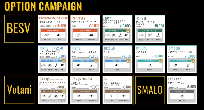 BESV、Votani、SMALOの3ブランド全21モデルが対象となるBIGキャンペーン。新車購入と同時に、人気オプションを特別価格で手に入れることができます。
