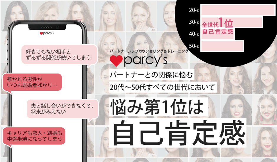 株式会社イグアス(本社:長崎県長崎市、代表取締役CEO:中村 あきら、以下「イグアス」)が運営する女性のためのパートナーシップカウンセリング&トレーニング「parcy's」(読み:「パーシーズ」)は、パートナーとの関係に悩む20代~50代女性1,000名を対象に「いま一番悩んでいること」の調査を行いました。結果、全世代の悩み第1位は相手との関係性そのものではなく「自身の自己肯定感の低さ」であることがわかりました。