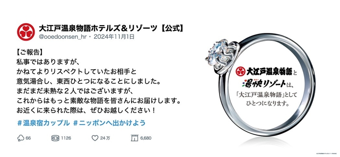ブランド統合に先んじて、10月28日(月)より、結婚報告風の「ブランド統合ご報告」を掲出いたします。これまで、東西でそれぞれカジュアル温泉宿を展開してきた2社が、共通の想いを持ち、今後は共に歩んでいくことを表現しています。