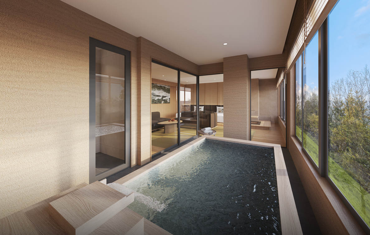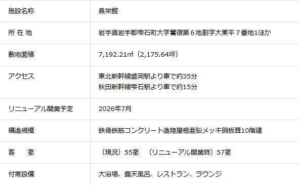 今回のリニューアル工事では、全国屈指の湯量(毎分1,000L 以上)を有する長栄館の魅力を最大限に生かし、岩手・雫石エリアを牽引する観光拠点となる温泉旅館を創出するため、ロビーやエントランス、大浴場や客室に至るまで、大規模な改装工事を行います。本プロジェクトを通じて、2社は、地域の魅力を再発見し、持続可能な観光資源として長栄館を再生することで、地域全体の活性化に寄与することを目指します。