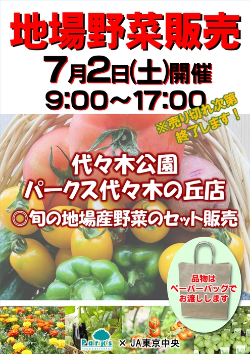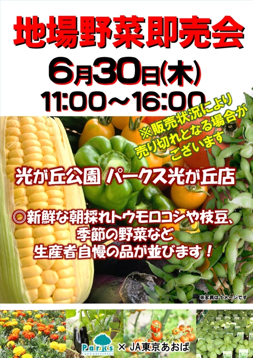 東京都公園協会が運営する光が丘公園内のパークス光が丘店・代々木公園内のパークス代々木の丘店・小金井公園内のパークス小金井店前において、地場野菜即売会(光が丘公園・小金井公園)、旬の地場野菜セット販売(代々木公園)を行います。