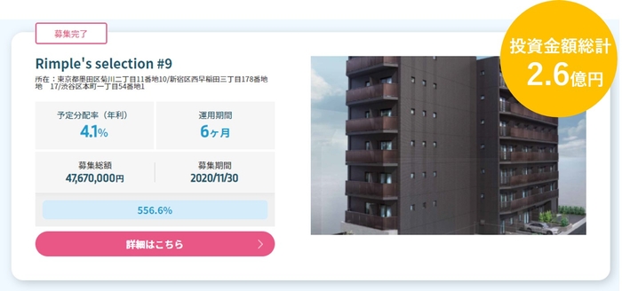 『IT』×『都心』×『不動産』で価値を創造する企業、プロパティエージェント株式会社(本社:東京都新宿区、代表取締役社長:中西 聖)が運営する不動産特定共同事業法に基づく不動産投資型クラウドファンディングサービス「Rimple(リンプル)」(以下、「Rimple」)において、Rimple’s Selection#9に、2億6,533万円のご応募をいただきました。これは、募集金額4,767万円(出資総額6,810万円のうち優先出資70%分)に対して556.6%となります。