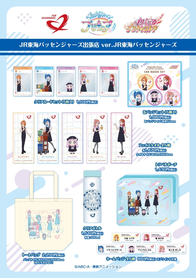 「ひろがるスカイ!プリキュア」のみんなが東海道新幹線パーサーに変身した描き下ろしイラストの各種グッズを、品川駅及び車内販売の他、プリキュア プリティストア常設店・プリキュア プリティストア20周年記念店舗で販売します。