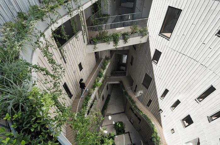 高層集合住宅にまだこのような新しい形式があったのか、と気付かされる建築である。共用部は極端に少なく、各室は数珠繋ぎとなってU字型を構成しており、中庭を囲んでいる。刻々とうつろう光と影、人々の暮らしが適度な距離感で垣間見える中庭の風景は、見ていて時を忘れるような体験である。光、風、視線が交錯する中庭の環境そのものを共有することで、緩やかでありながら強烈な関係性が構築されている。この関係性の距離感が極めて現代的であり、それが建築デザインによってもたらされていることが秀逸である。また、中庭に複雑な影を生み出す外観は、林地残材を活用した型枠によって生み出されており、設計者が型枠化までの試行錯誤を行って実現に結びつけた点についても高く評価したい。